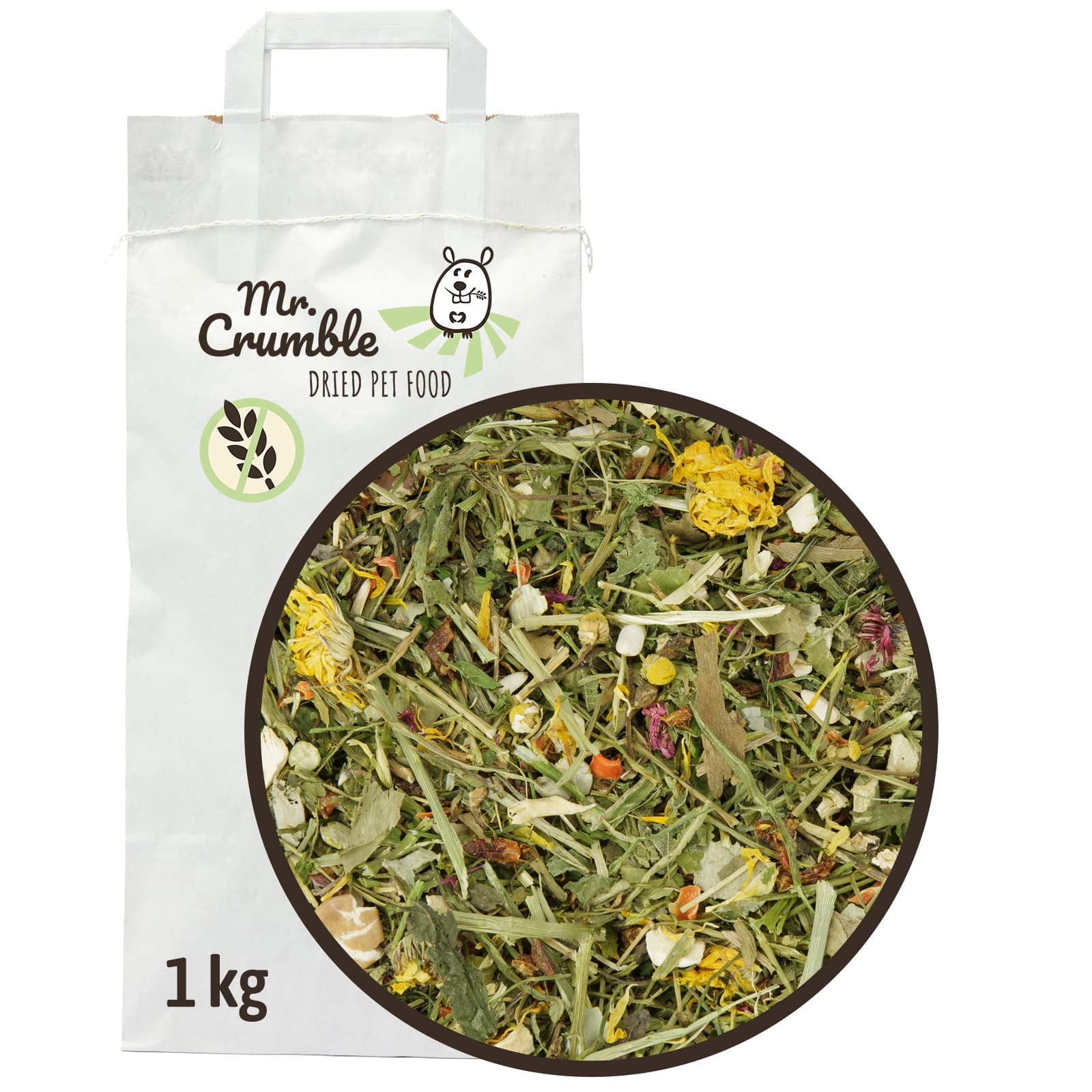 Zusammensetzung: Grüner Hafer, Dillstiele, Petersilienstängel, weiße Sonnenblumenkerne, Karottenstücke, Löwenzahnwurzel geschnitten, Erbsenflocken, Bohnenflocken, Pastinake, Brennnessel, Löwenzahn, Paprika (rot), Ringeblume, Pfefferminze, Gingkoblätter, Lindenblätter, Kornblumenblüten rot, Rotkleeblüten, Kamillenblüten.