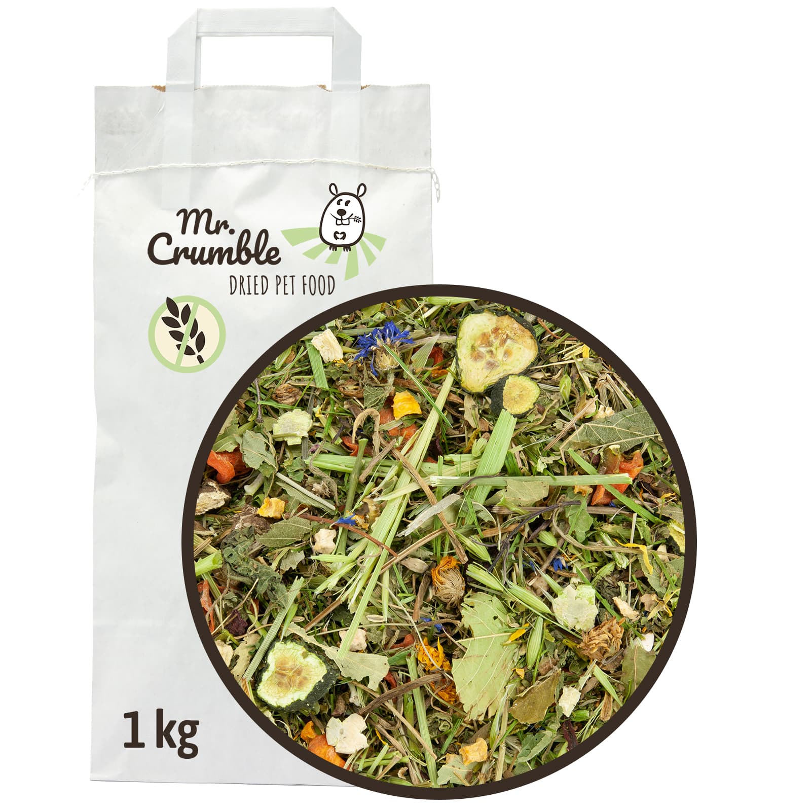 Zusammensetzung: Bio-Gräser & Kräuter (8,5 %), Karottenscheiben (8 %), Grüner Hafer (7 %), Dill (7 %), Erbsenflocken (7 %), Pastinake (6 %), Löwenzahnwurzel (4 %), Rote Bete (4 %), Kerbel (4 %), Löwenzahn (4 %), Brennnessel (4 %), Kürbiswürfel (3 %), Birkenblätter (3 %), Kirschblätter (3 %), Leinsaat (3 %), Mariendistelsaat (3 %), Sonnenblumenkerne (3 %), Haselnussblätter (2 %), Zinnkraut (2 %), Ringelblumenblüten (2 %), Hibiskusblüten (2 %), Hagebutten (2 %), Rotkleeblüten (1,5 %), Apfelwürfel (1,5 %), Bananenstücke (1,5 %), Gurkenscheiben (1 %), Pfefferminze (1 %), Fenchelsamen (1 %), Kornblumenblüten (1 %').