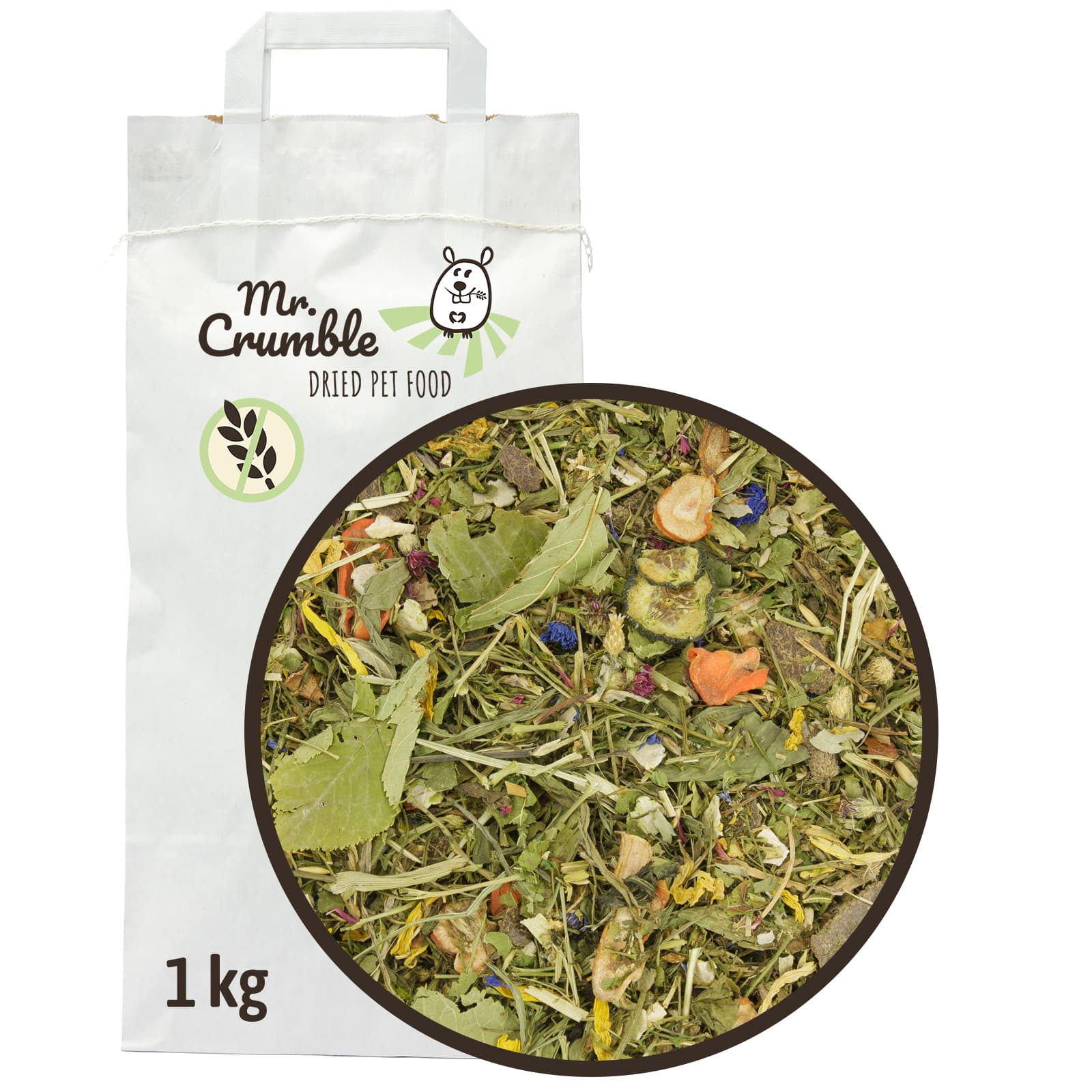 Zusammensetzung: Grüner Hafer, Petersilienstängel, Korianderstiele, Leinflocken, Karottenscheiben, Hafer, Erbsenflocken, Kerbel, Löwenzahnwurzel, Spitzwegerich, Kirschblätter, Erdbeerblätter, Pastinake, Mariendistelsamen, Zucchini, Broccoli, Maulbeerblätter, Melisse, Pfefferminze, Sonnenblumen-Blütenblätter, Kornblume rot, Kornblume blau, Gurkenscheiben.