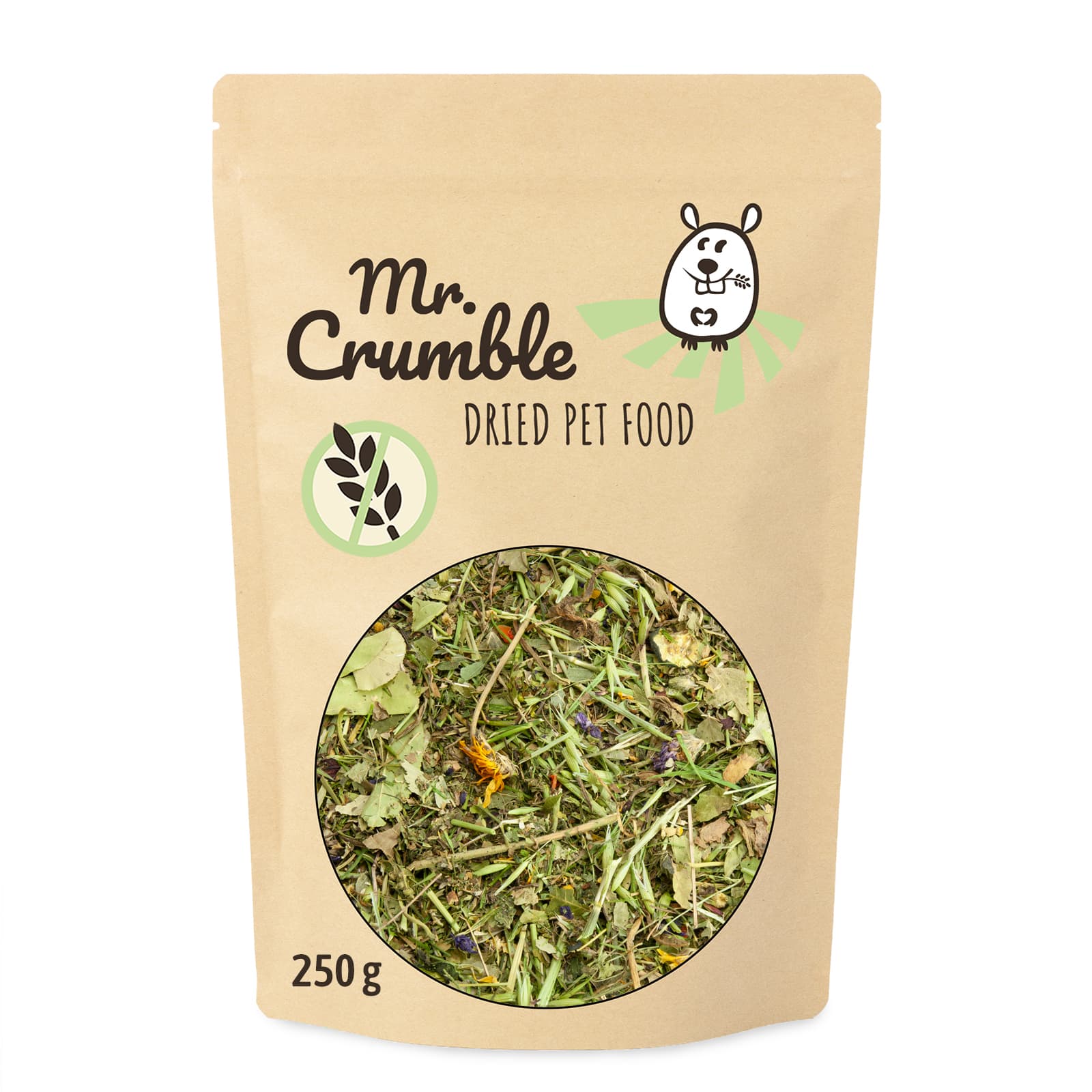 Zusammensetzung: Petersilienstängel (12 %), Grüner Hafer (11 %), Bio- Gräser & Kräuter (9 %), Brennnessel (8 %), Löwenzahn (8 %), Spitzwegerich (8 %), Birkenblätter (5 %), Walnussblätter (5 %), Luzernestängel (4 %), Dillstiele (3 %), Johanniskraut (3 %), Apfelblätter (3 %), Maulbeerblätter (3 %), Karottenwürfel (2 %), Zucchiniwürfel (2 %), Oregano (2 %), Ringelblume (2 %), Gingkoblätter (1 %), Hibiskusblüten (1 %), Rosmarin (1 %), Eichenrinde (1 %), Kamillenblüten (1 %), Kürbiswürfel (1 %), Rote Beete (1%), Pfefferminze (1 %), Fenchel (0,5 %), Malvenblüten (0,5 %), Rotkleeblüten (0,5%).